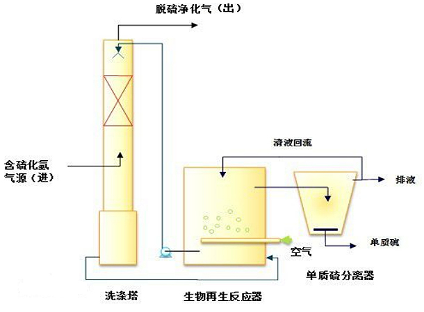 生物脫硫是堿式洗滌塔與生物再生反應器的結合,洗滌塔用來去除氣態流體中的硫化氫,再生反應器中堿得到再生。該脫硫方式采用洗滌塔外加氧曝氣的方式,這種處理后的沼氣中不含空氣中的氮氣、氧氣。硫化物在再生器內完成被氧化的過程,使液態硫化物轉化成硫單質,形成硫泥。通過曝氣、加熱、加營養鹽、加堿等手段,保持循環液的主要技術參數,給脫硫微生物創造穩定、適宜的生存環境,確保了堿液回收和洗滌塔的脫硫效果。