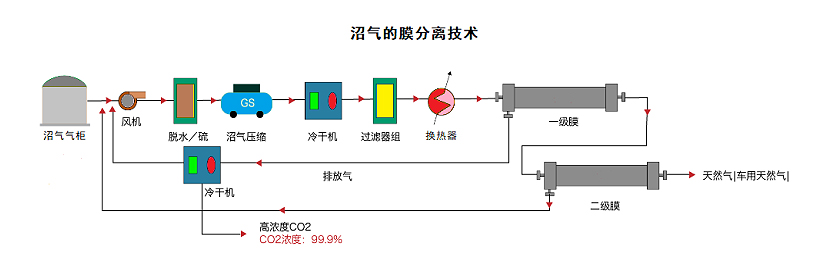 采用先進的膜分離技術把二氧化碳從沼氣或者填埋氣中去除,從而產生高純度的甲烷氣體產品,并具有一定壓力,方便進一步的加工。