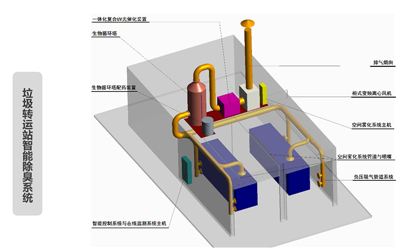軟封閉與隔音+植物提取液除臭劑中和反應惡臭+生物菌劑洗滌廢氣+ Tio2光解催化氧化除臭工藝。