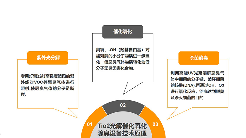 在Tio2光解催化氧化除臭設備內,高能紫外線光束與空氣、TiO2反應產生的臭氧、-OH (羥基自由基)對惡臭氣體(硫化氫、氨氣、硫醇)進行協同分解氧化反應,使惡臭氣體物質轉化為無臭味的小分子化合物或完全礦化,生成水和CO2,達標后經排風管排入大氣。